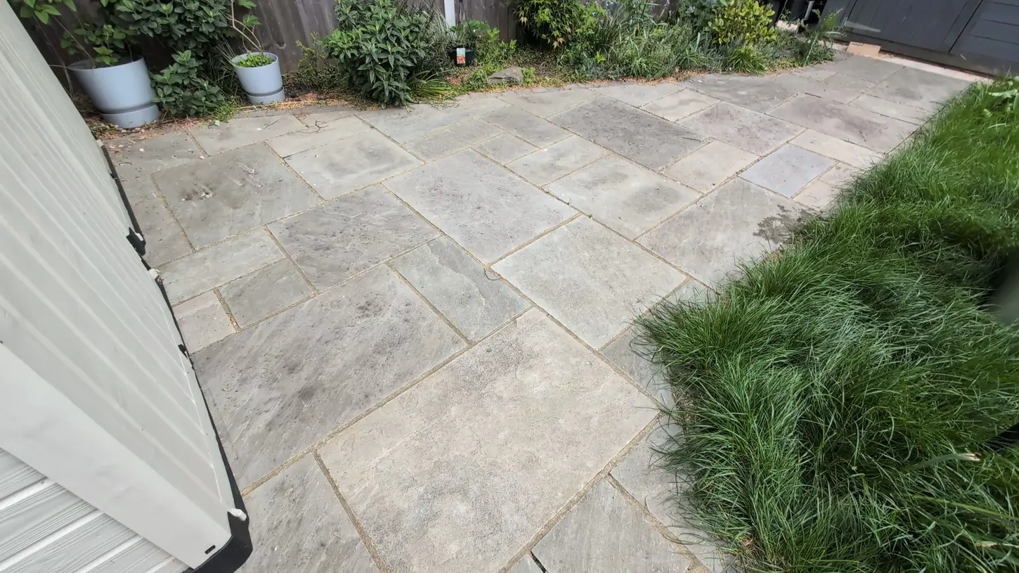 Executed a dual-surface restoration project in Buckingham, utilizing a two-stage "Cut Down" oxidation and residual biocide protocol to reverse severe organic colonization on block paving and flagstones.