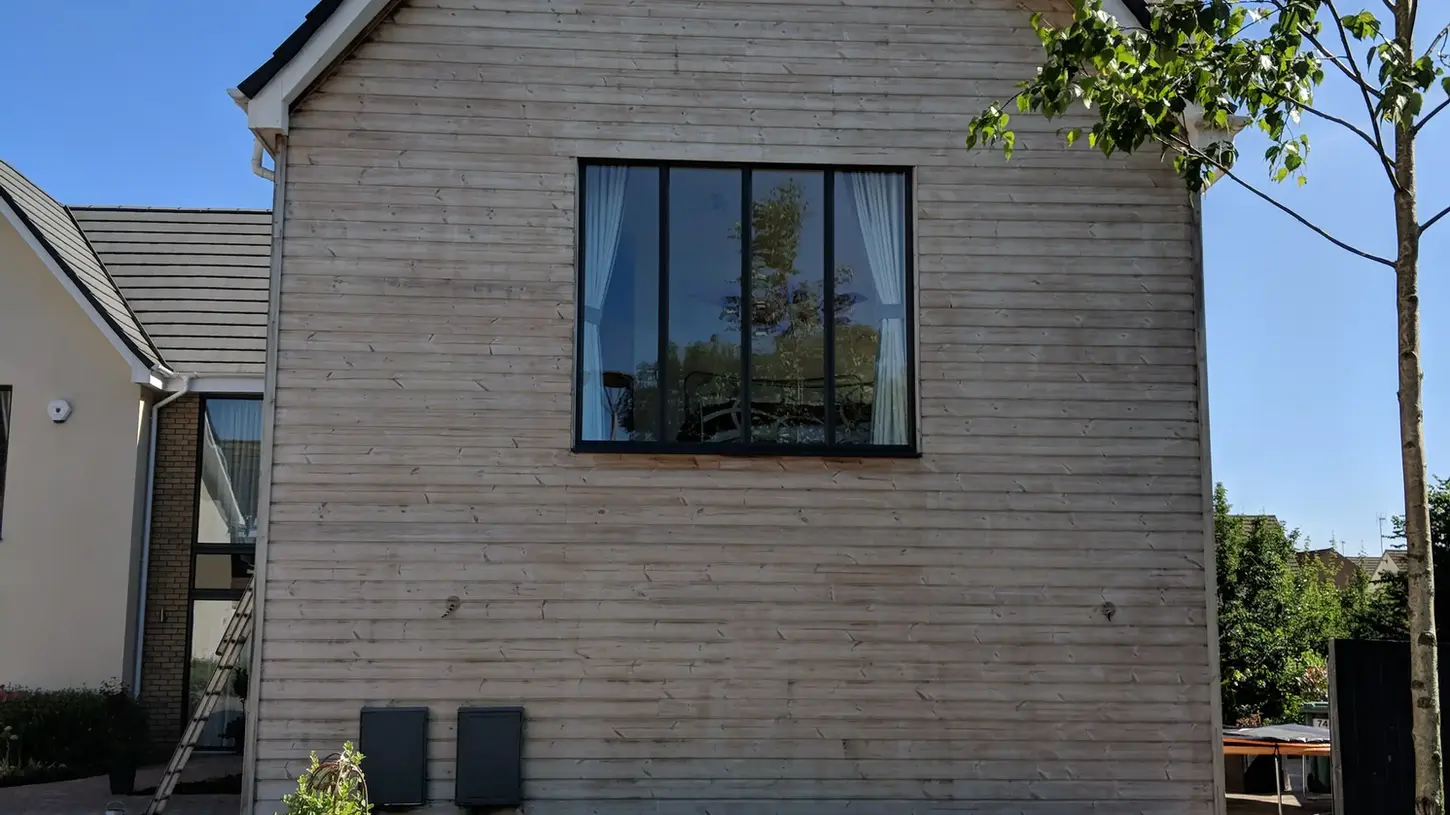 This project required a forensic approach to timber restoration. The property's silverwood cladding had suffered from 6-10 years of organic ingress, resulting in heavy black mold and algae colonization. Using a manual soft wash injection system, we treated the timber without high pressure, ensuring the wood fibers remained intact. The process involved a multi-stage chemical application to "bleed out" deep-seated organic matter, followed by a precise application of Osmo oil to seal the restored surface against the humid Bedfordshire climate.